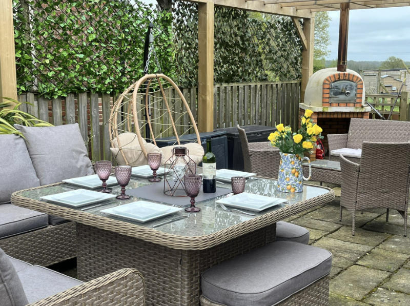 As you step into the farmhouse, you're greeted by a cosy living room adorned with a crackling open fire, creating a warm ambiance for relaxed evenings with loved ones. The spacious kitchen boasts a Range cooker, inviting you to indulge in culinary adventures. Step outside onto the patio, where a pizza oven awaits, perfect for alfresco dining under the stars. With three bedrooms, including a master suite and two additional well-appointed rooms, our farmhouse comfortably accommodates families or groups of friends seeking tranquillity and rejuvenation.